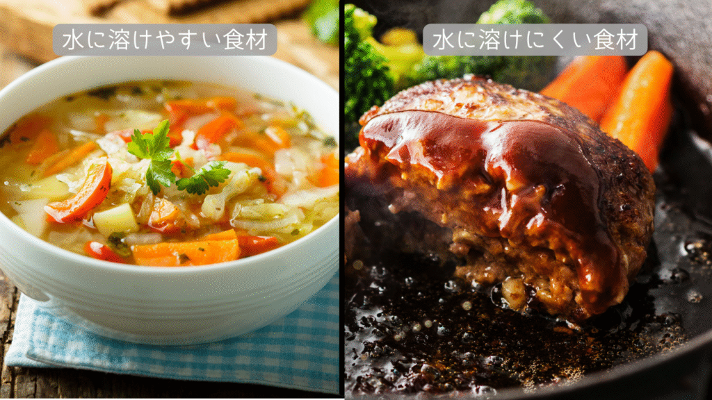 | 水に溶けやすい食材 (スープで栄養がとれる) | 水に溶けにくい食材 (食材を直接食べる必要あり) |